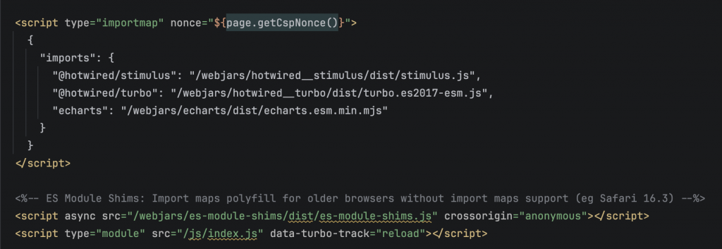 Something else that turned out to be super cool is that we could tie in importmaps with webjars and have those dependencies served directly from our spring boot app without needing a third party CDN. The other interesting thing in that screenshot is our main entry point “/js/index.js” and as you would expect that’s where we link all of our javascript so the browser can load them: