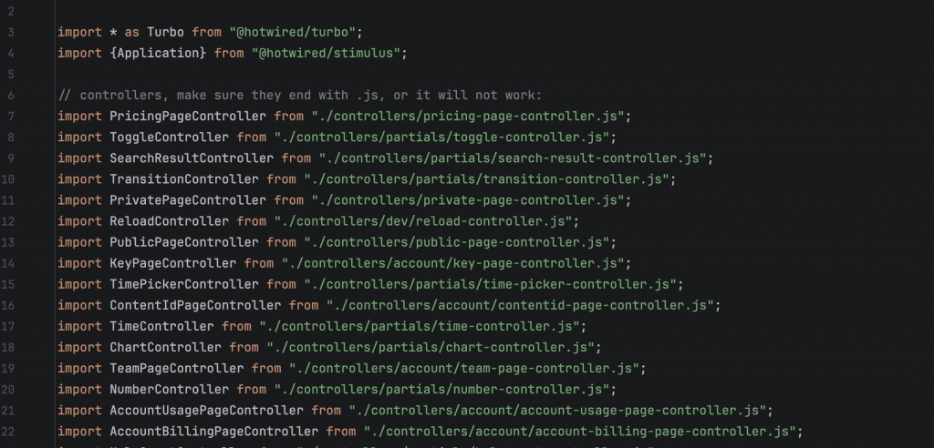 This is the idea that for certain actions the browser full page reload cycle is just too long and makes your application feel sluggish. It is the reason SPA’s were originally created for, shipping most of the app to the client at once and perform smaller partial server updates. To achieve SPA levels of interactivity with a single codebase we again followed Rails lead and decided for Turbo and Stimulus from Hotwire.dev. This gave us automatic partial page updates (with Turbo) and a familiar MVC framework (with Stimulus) for the Javascript we still needed. With that said, with importmaps in place, we could have stuck with React for component rendering and that is something we could still introduce in the future for certain components that it just doesn’t make sense to port to Stimulus.